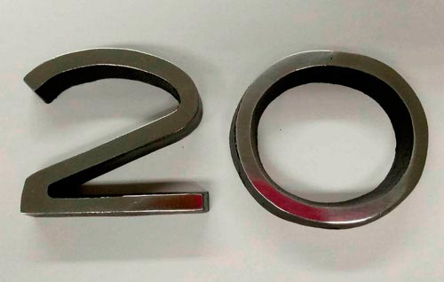 Letra tipo caixa em chapa galvanizada, aço inox, latão ou alumínio fundido.